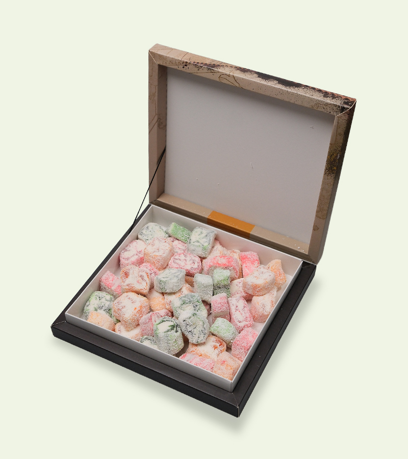 Meyveli Vezir Lokum, meyve aromalarıyla zenginleştirilmiş özel bir lokumdur. Renkli ve lezzetli bir seçenektir.